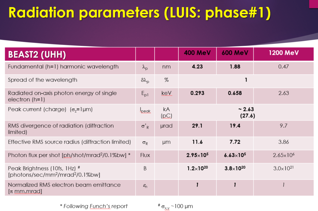 Table 1: Incoherent photon beam parameters, available for the photon user community after commissioning of the LUIS-phase1 setup