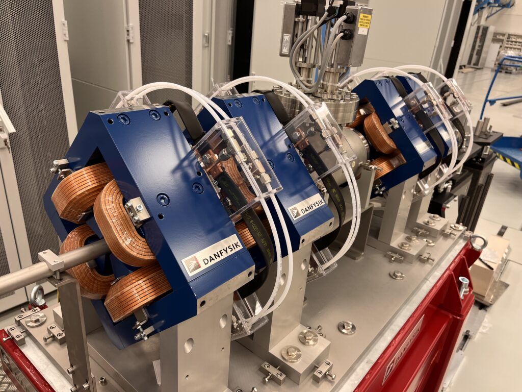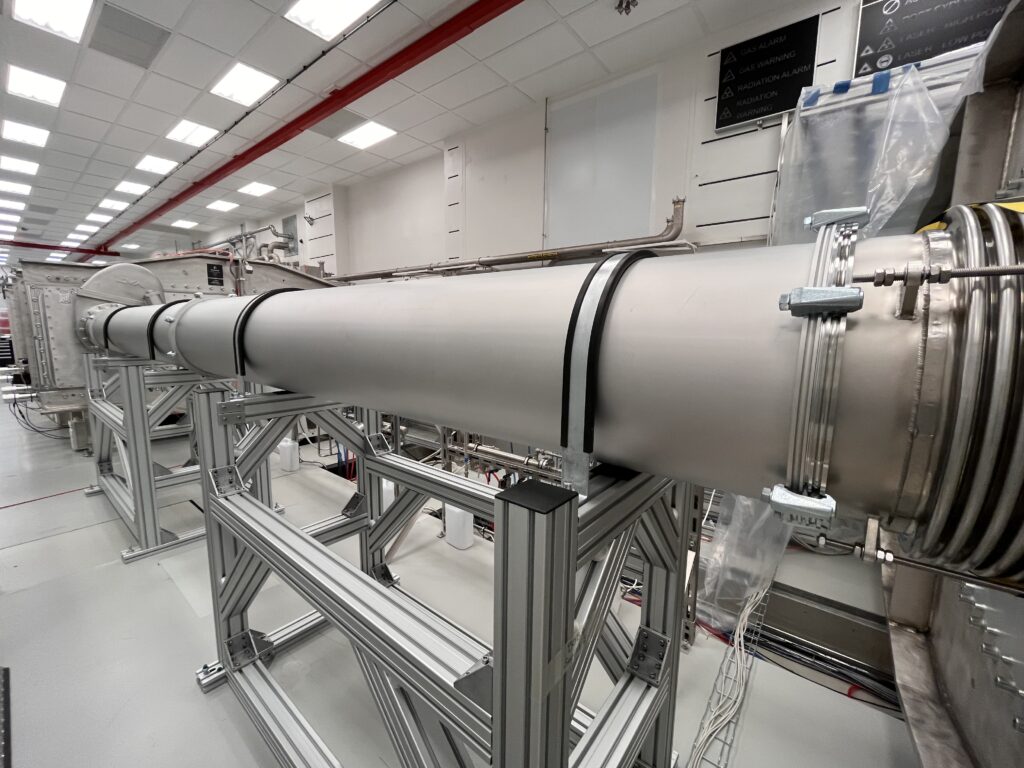 The large size of this experimental hall (about 50m extendable up to 110m for the future use of the 10PW kilo-Joule class laser) enables the use of very long focal lengths for laser-matter interaction and allows for various possibilities such as testing a multi-stage electron acceleration approach and, most important, the use of magnetic undulators for the future perspective of generating X-ray radiation in the so-called XFEL scheme.