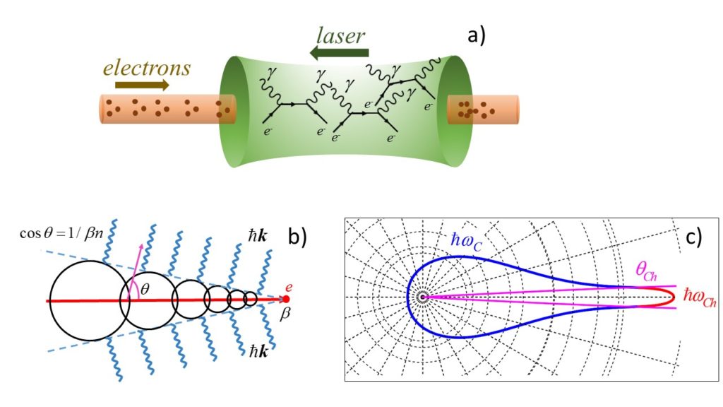 The unique features of LWFA make it a key technology for developing compact electron-positron colliders and for studying novel regimes of electromagnetic field interaction with matter and quantum vacuum, as shown in Fig. 3. In the limit of extremely strong electromagnetic waves, the radiation friction, which accompanies the conversion of radiation from the optical range to the gamma photon energy range, fundamentally changes the plasma behavior. With further increase of the laser intensity the quantum effects of the recoil bring the laser interaction with charged particles to the multi-photon Compton scattering regime. This process is accompanied by the production of electron-positron pairs. These phenomena are also considered for revealing of the vacuum properties predicted by quantum electrodynamics: in the limit of extremely intense electromagnetic fields the Maxwell equations are modified due to the photon-photon scattering that makes the vacuum refraction index to depend on the field amplitude. In presence of electromagnetic waves the vacuum behaves as a dispersive medium. The laser accelerated ultra-high energy electrons colliding with super-intense electromagnetic field will undergo the Synergic Cherenkov Radiation–Compton Scattering (SCCRS), when the Cherenkov radiation occurs due to the QED vacuum polarization (see Fig. 3).