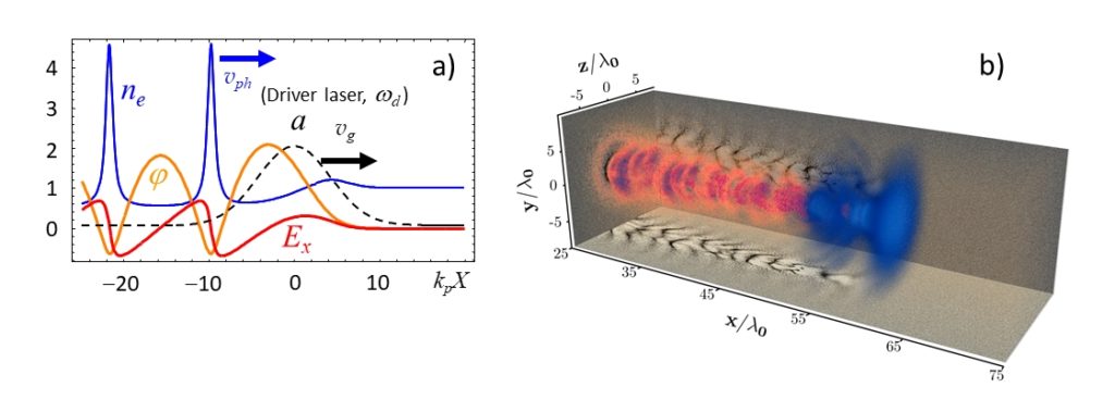 Figure (1) (a) 1D wake wave: electric field, electrostatic potential, and electron density behind the laser pulse; (b) 3D wake wave (yellow-red) excited by ultra-short pulse laser (blue) in the near critical plasma density targets. In the (x,y) and (x,z) planes the electron density distribution is shown. This simulation has been performed with the ELI Beamlines HPC Eclipse.