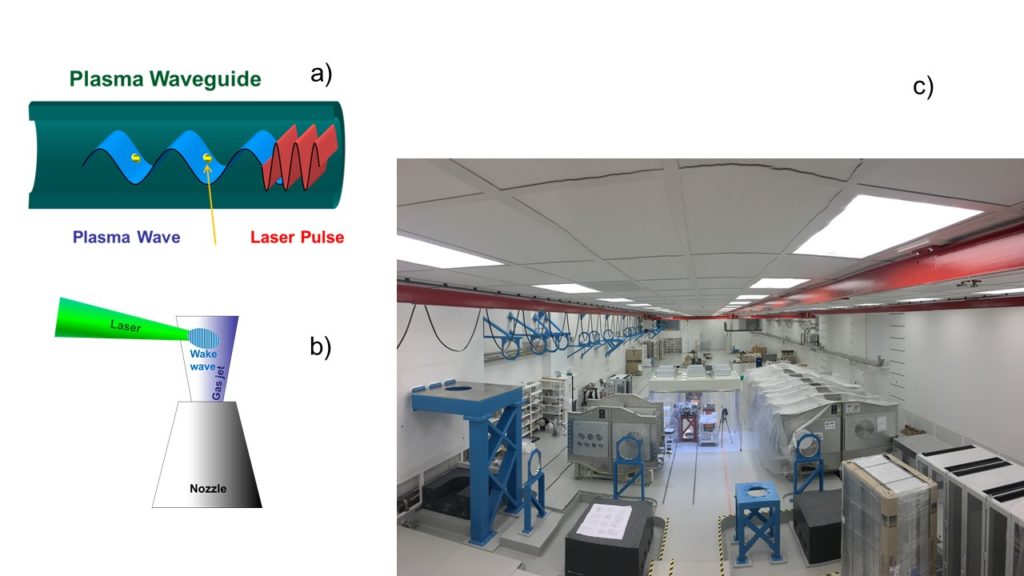Figure (6) (a) Compact electron accelerator with ultrahigh axial electric fields are generated by the ultra-short pulse laser driving the plasma wakefields. (b) Wake field excitation by the laser pulse interacting with the gas jet ejected from the nozzle. (c) Picture of the experimental hall E5 at ELI Beamlines. The PW laser beam transport and the electron acceleration beamline are being installed.
