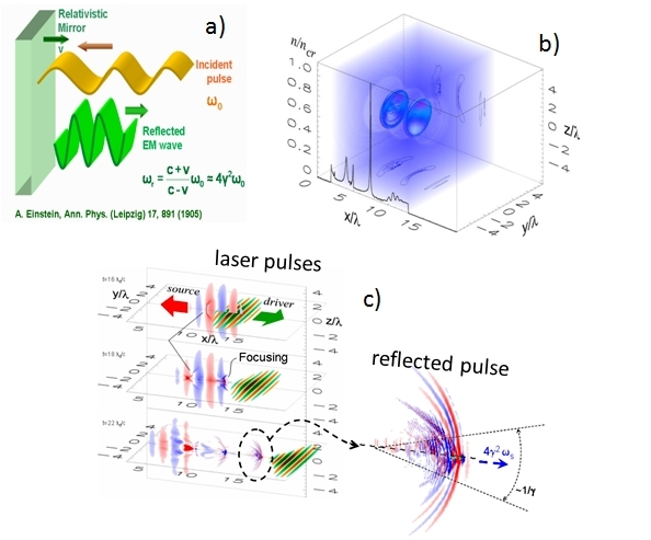 Figure (4) Concept of Relativistic Flying Mirror: (a) Light reflection from relativistic mirror; (b) Paraboloidal relativistic electron shells in the wake behind the laser pulse; (c) Two laser pulses colliding in plasma (inset: reflected electromagnetic pulse with upshifted frequency is compressed in longitudinal and transverse directions)