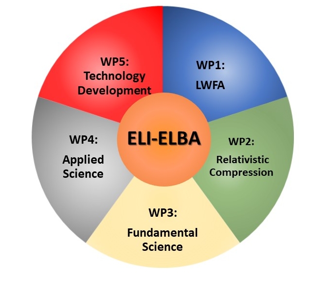 Figure (5) The five work packages of ELI–ELBA scientific activity. WP1 is devoted to the development of the LWFA based high energy electron source. With the WP2 the charged particle interaction with extremely intense electromagnetic field is being studied. The electromagnetic wave frequency up-shifting and the wave intensification by colliding the laser pulses counter-propagating in a plasma will be carried out within the WP3 package. The work package WP4 investigates the utilization of radiation sources developed in WP1, WP2, and WP3 in other scientific fields. WP5 is devoted for collaborative technology development with external users and other ELI Bemalines teams.