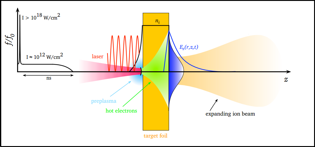 In general, such high energy ion beams are produced in thin solid targets by a strong electric field, which is, in turn, generated by a collective displacement of a large number of electrons. Such fields accelerate ions until charge neutrality is restored and they move together with electrons in a ballistic way. Until now, most of the experiments on laser-driven proton acceleration have been performed in a regime known as Target Normal Sheath Acceleration (TNSA). This scheme is based on the space-charge field generated at the rear surface of a micrometer-thick target. Such a quasi-electrostatic field is generated by high energy electrons, also known as “hot electrons”, which are accelerated by a high intensity laser at the target front surface, then cross the target bulk and attempt to escape in a vacuum from the rear side (see figure below). Currently, thanks to higher laser intensities achievable with newly installed laser systems, along with the use of thinner and specially engineered targets, new acceleration mechanisms are emerging. Protons can be consequently accelerated not only by longitudinal electric fields (established because of space charge separation), but also by laser radiation pressure, plasma shock waves and relativistic-induced transparency acceleration mechanisms [Macchi et al].