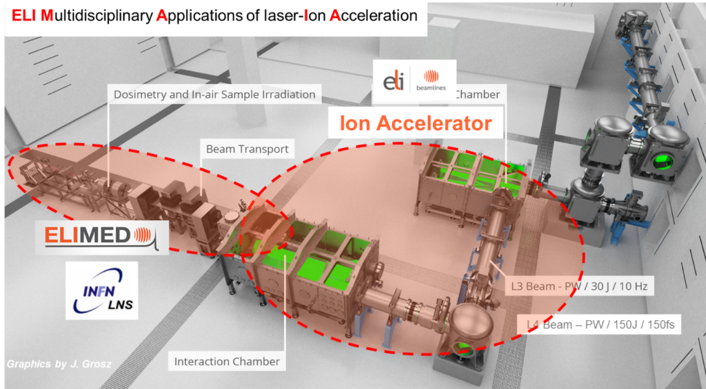 Currently, the scenarios of laser driven acceleration as well as particle handling systems are being improved in order to fulfill requirements of foreseen applications with strong socioeconomic impact e.g. cancer treatment (laser-driven hadrontherapy), fast ignition of inertial confinement fusion (ICF) targets, laser triggering and control of nuclear reactions, material science, non-destructive heritage testing, chemistry etc. [Macchi et al, al]. The main direction proposed by the community of experts in this field is to improve the laser-accelerated ion features (maximum energy and energy spread, charge, emittance, shot-to-shot stability, etc.) in order to propose reliable and very compact approaches to be used for societal applications, thus reducing the overall cost of standard large-size acceleration facilities. The main goal of the ion beamline being commissioned at ELI Beamlines, ELIMAIA (ELI Multidisciplinary Applications of laser-Ion Acceleration) [], is to provide well-characterized, highly stable and tunable beams of particles accelerated by PW-class lasers to be offered to the user community for multidisciplinary applications. Medical applications are clearly the most attractive among those envisioned, since they might have a strong, positive impact on society. In particular, a potential use of laser-based hadrontherapy facilities is currently under investigation at the international level, as demonstrated by the ELIMED (ELI MEDical applications) network. The ELIMAIA beamline will allow users to investigate multidisciplinary applications using laser driven ion beams, such as in-vitro radiation biology and pre-clinical studies within the ELIMED international cooperation.