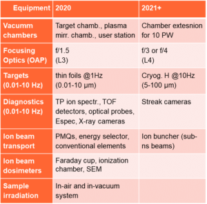 The first subsystem is represented by a double plasma mirror chamber and main interaction chamber. The plasma mirror system allows to clean the laser beam from sub-nanosecond pre-pulses. The beam then continues its propagation into the interaction chamber through a laser diagnostic section where various laser parameters, such as energy, pulse duration and wavefront, are measured. After a proper control of their properties, the laser beams are focused onto the target by off-axis parabolic mirrors. The main proton/ion beam produced at the laser-target interaction point propagates from west to east and is sent into the ELIMED subsystem, which is represented by the in-vacuum ion beam transport and diagnostics, and by the in-air ion beam dosimetry and sample-irradiation sections. The accelerated ions are collected by a set of permanent magnet quadrupoles to be used for a preliminary focalization and for a rough energy selection of the laser-driven ion beams. The beam transport line accommodates various diagnostic systems (high energy Thomson Parabola spectrometer, detector arrays for beam emittance measurements, time-of-flight detectors). The accelerated proton/ion beam is shaped in space and in energy according to the specific request coming from the user. A set of quadrupole magnets, focusing the accelerated particle beam (typically having a high angular divergence), and an energy selector system, selecting the required energy window, is used to address this issue. The particle beam then enters the in-air ion beam dosimetry section where its properties are measured at different positions and further shaped, depending on the specific user application. Therefore, the dose released to the final sample (e.g., a radiobiological one) is monitored with relative and absolute dosimetry systems, ad-hoc developed for ultrahigh dose rate ion bunches, allowing real-time control of the delivered particle beam. A detailed description of the various technologies available at the ELIMAIA beamline can be found in . The expected ion beam features, along with key equipment available at ELIMAIA, are summarized in the tables below.
