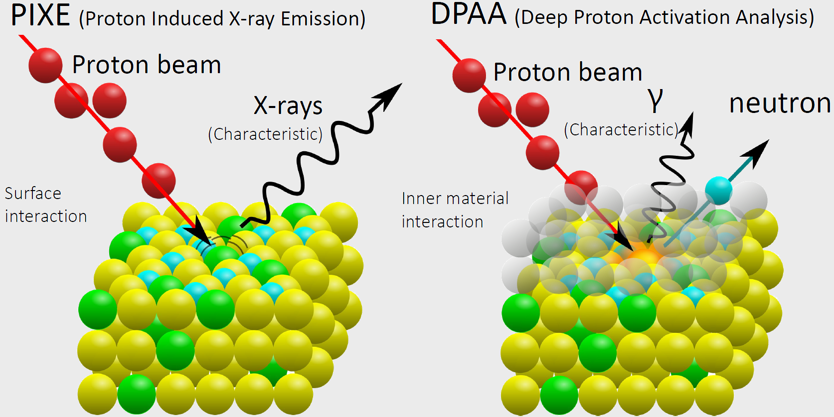 Schematic principle of PIXE and of DPAA techniques, [part of the image taken from Institute of Physics, University of Sao Paulo websites]